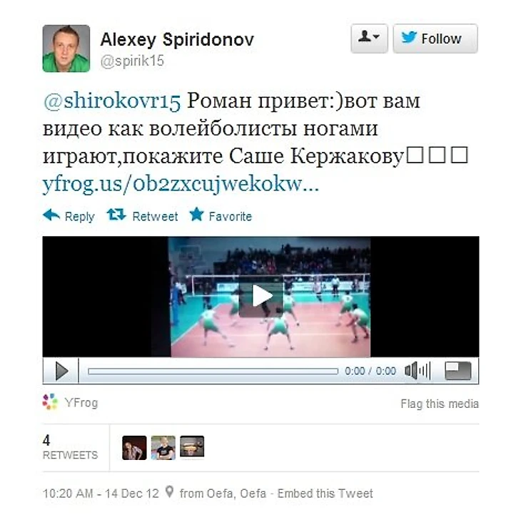 Самый главный твит Спиридонов написал в декабре 2012-го – бескомпромиссному футболисту Широкову. И хотя Роман не ответил, Спиридонов вскоре получил почти 300 новых подписчиков, минуту славы на «Дожде» и Sports.ru.