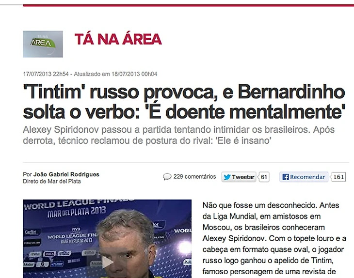 У Спиридонова проблемы с волейболом, к которому нужно относиться с уважением. Он здесь не к месту. Ему нужно лечиться.» (O Globo).