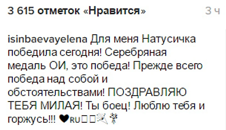 «Для меня Натусичка победила сегодня! Серебряная медаль Олимпийских игр – это победа. Прежде всего, победа над собой и обстоятельствами. Поздравляю тебя, милая! Ты – боец! Люблю тебя и горжусь», – написала Исинбаева.